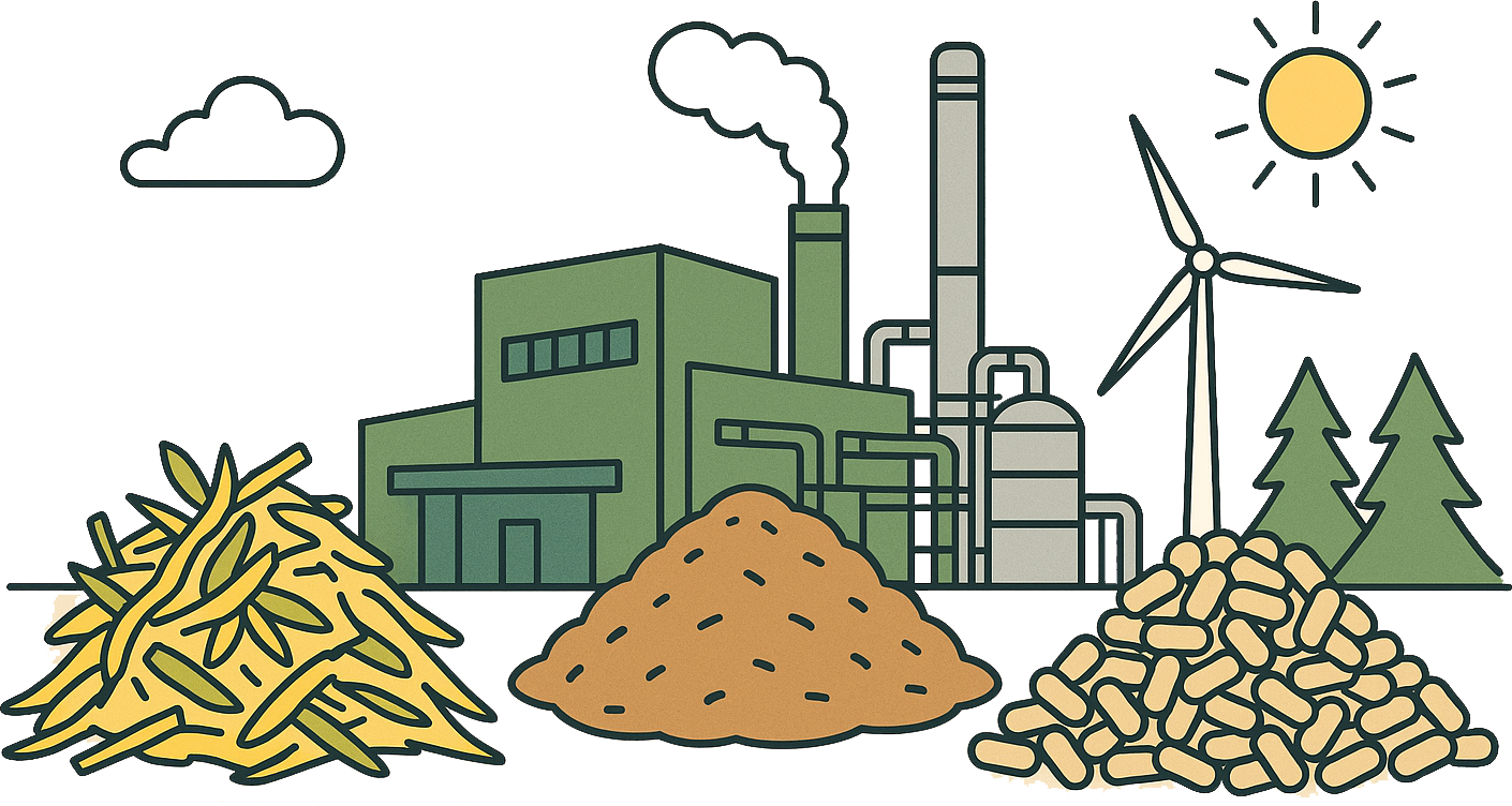 木質チップや食品廃棄物などの再生可能資源を活用し、地域循環型エネルギーの創出を実現。