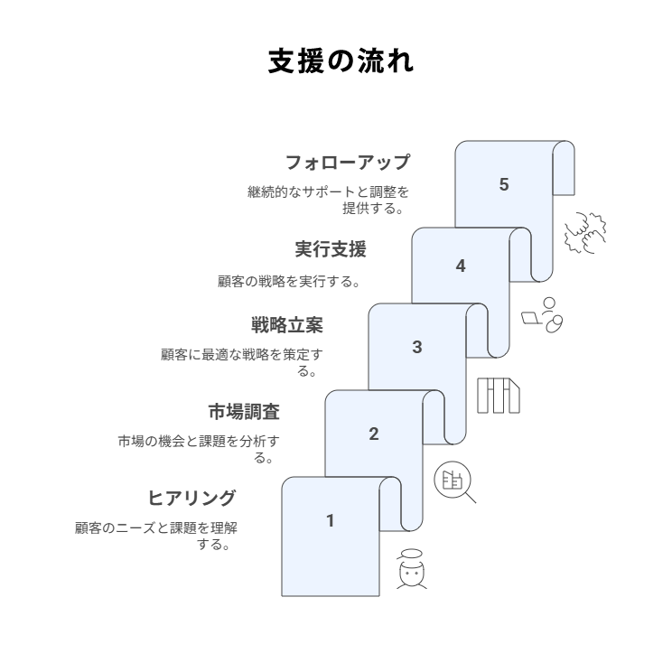 当社では、お客様一社一社のニーズに応じた最適な支援をご提供するため、以下のステップで海外展開をサポートいたします。