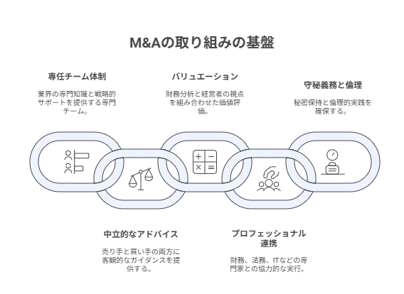 財務・法務・税務・労務・ITなど各領域の専門家と連携し、デューデリジェンスからPMIまで確実に遂行します。 - 守秘義務と倫理を重視した安心の運営体制